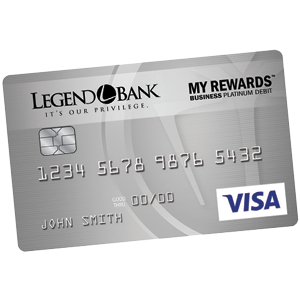 Maximize the benefits of your everyday business debit card purchases with the Legend Bank My RewardsTM Visa® Business Platinum Debit Card. Enjoy bonus rewards, cash back, roadside assistance and more. Plus receive $100,000 Travel Accident Insurance and 24/7 Remote Tech Support.